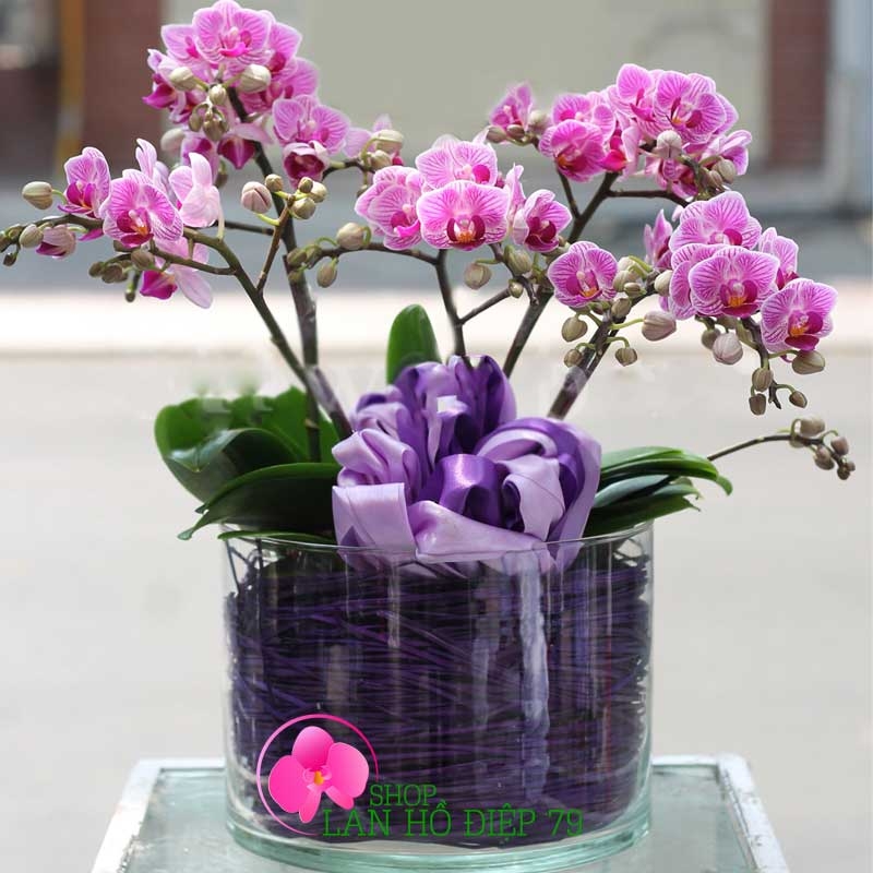Chậu lan hồ điệp mini đẹp được phối ghép 4 cành hoa lan màu tím dạng hoa chùm rất nhiều bông, với thiết kế sang trọng và đẹp mắt sẽ là món quà thật ý nghĩa để tặng cho bạn bè, người thân, khách hàng, đối tác... Sản phẩm rất phù hợp đặt ở bàn làm việc, trước sảnh văn phòng công ty, nhà hàng, khách sạn, cửa hàng. Ngoài ra hoa lan hồ điệp còn được tặng vào những dịp chúc mừng khai trương, sinh nhật, khánh thành, hội nghị, thăng chức, mừng thọ, ngày cưới, kỉ niệm thành lập công ty...