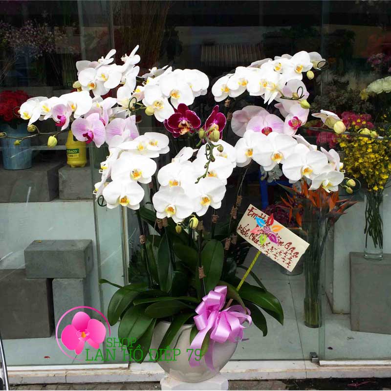 Chậu lan hồ điệp đẹp được phối ghép 9 cành hoa lan màu trắng với thiết kế sang trọng và đẹp mắt sẽ là món quà thật ý nghĩa để tặng cho bạn bè, người thân, khách hàng, đối tác... Sản phẩm rất phù hợp đặt ở bàn làm việc, trước sảnh văn phòng công ty, nhà hàng, khách sạn, cửa hàng. Ngoài ra hoa lan hồ điệp còn được tặng vào những dịp chúc mừng khai trương, sinh nhật, khánh thành, hội nghị, thăng chức, mừng thọ, ngày cưới, kỉ niệm thành lập công ty...