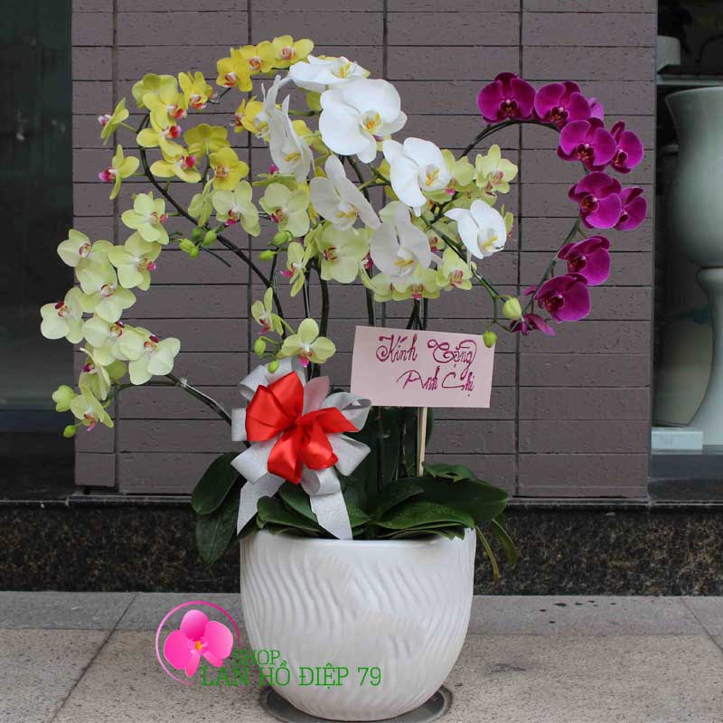 Chậu lan hồ điệp đẹp được phối ghép 7 cành hoa lan trắng, tím và vàng với thiết kế sang trọng và đẹp mắt sẽ là món quà thật ý nghĩa để tặng cho bạn bè, người thân, khách hàng, đối tác... Sản phẩm rất phù hợp đặt ở bàn làm việc, trước sảnh văn phòng công ty, nhà hàng, khách sạn, cửa hàng. Ngoài ra hoa lan hồ điệp còn được tặng vào những dịp chúc mừng khai trương, sinh nhật, khánh thành, hội nghị, thăng chức, mừng thọ, ngày cưới, kỉ niệm thành lập công ty...