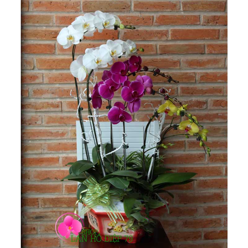 Chậu lan hồ điệp đẹp được phối ghép 5 cành hoa lan trắng, tím và vàng với thiết kế sang trọng và đẹp mắt sẽ là món quà thật ý nghĩa để tặng cho bạn bè, người thân, khách hàng, đối tác... Sản phẩm rất phù hợp đặt ở bàn làm việc, trước sảnh văn phòng công ty, nhà hàng, khách sạn, cửa hàng. Ngoài ra hoa lan hồ điệp còn được tặng vào những dịp chúc mừng khai trương, sinh nhật, khánh thành, hội nghị, thăng chức, mừng thọ, ngày cưới, kỉ niệm thành lập công ty...
