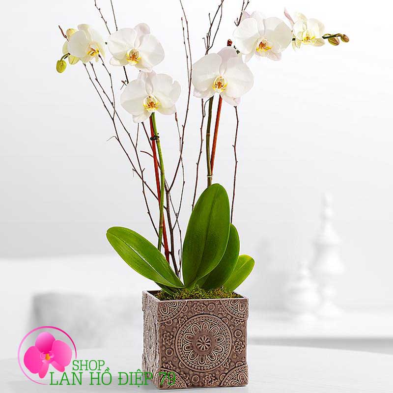 Chậu lan hồ điệp đẹp được phối ghép 2 cành hoa lan màu trắng với thiết kế sang trọng và đẹp mắt sẽ là món quà thật ý nghĩa để tặng cho bạn bè, người thân, khách hàng, đối tác... Sản phẩm rất phù hợp đặt ở bàn làm việc, trước sảnh văn phòng công ty, nhà hàng, khách sạn, cửa hàng. Ngoài ra hoa lan hồ điệp còn được tặng vào những dịp chúc mừng khai trương, sinh nhật, khánh thành, hội nghị, thăng chức, mừng thọ, ngày cưới, kỉ niệm thành lập công ty...