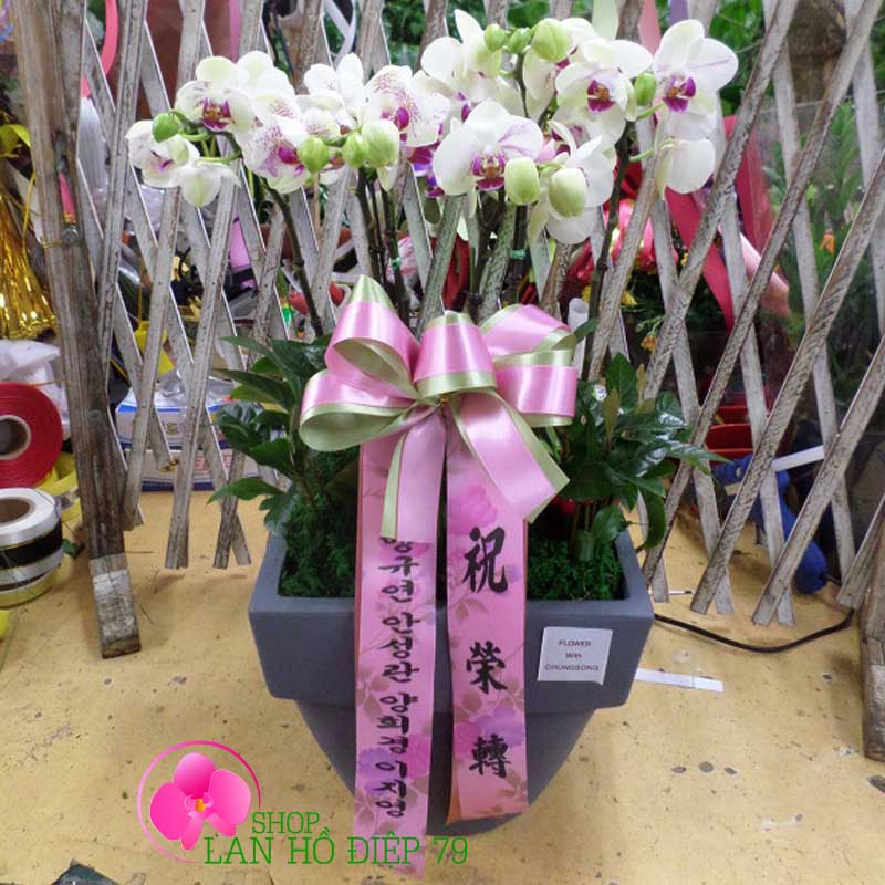 Chậu lan hồ điệp mini đẹp được phối ghép 5 cành hoa lan màu trắng dạng hoa chùm rất nhiều bông, với thiết kế sang trọng và đẹp mắt sẽ là món quà thật ý nghĩa để tặng cho bạn bè, người thân, khách hàng, đối tác... Sản phẩm rất phù hợp đặt ở bàn làm việc, trước sảnh văn phòng công ty, nhà hàng, khách sạn, cửa hàng. Ngoài ra hoa lan hồ điệp còn được tặng vào những dịp chúc mừng khai trương, sinh nhật, khánh thành, hội nghị, thăng chức, mừng thọ, ngày cưới, kỉ niệm thành lập công ty...