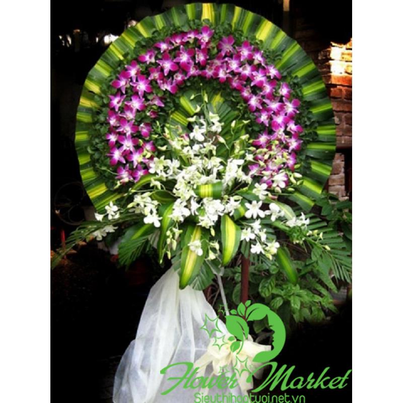 Hoa chia buồn cao từ 1,5m - 1,8m với hoa chủ đạo là hoa lan và hoa hồng kết hợp với hoa lá phụ cùng phụ kiện cao cấp mang thông điệp chia buồn sâu sắc gửi đến thay cho lời động viên, an ủi đến gia quyến người mất và người đã khuất mong sớm...