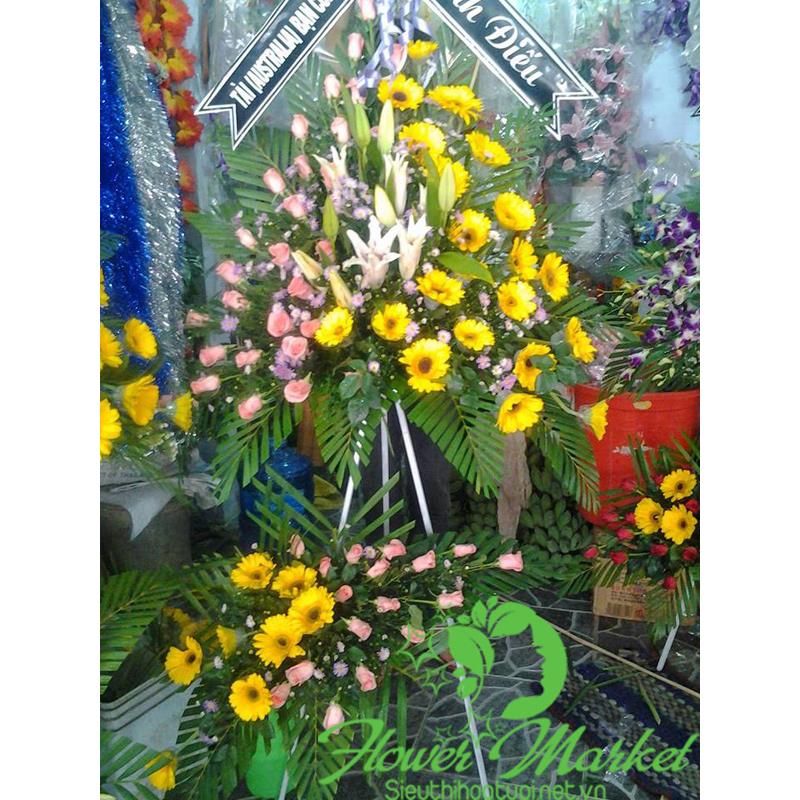 Hoa chia buồn cao từ 1,5m - 1,8m với hoa chủ đạo là hoa hồng, đồng tiền và hoa ly kết hợp với hoa lá phụ cùng phụ kiện cao cấp mang thông điệp chia buồn sâu sắc gửi đến thay cho lời động viên, an ủi đến gia quyến người mất và người đã khuất...