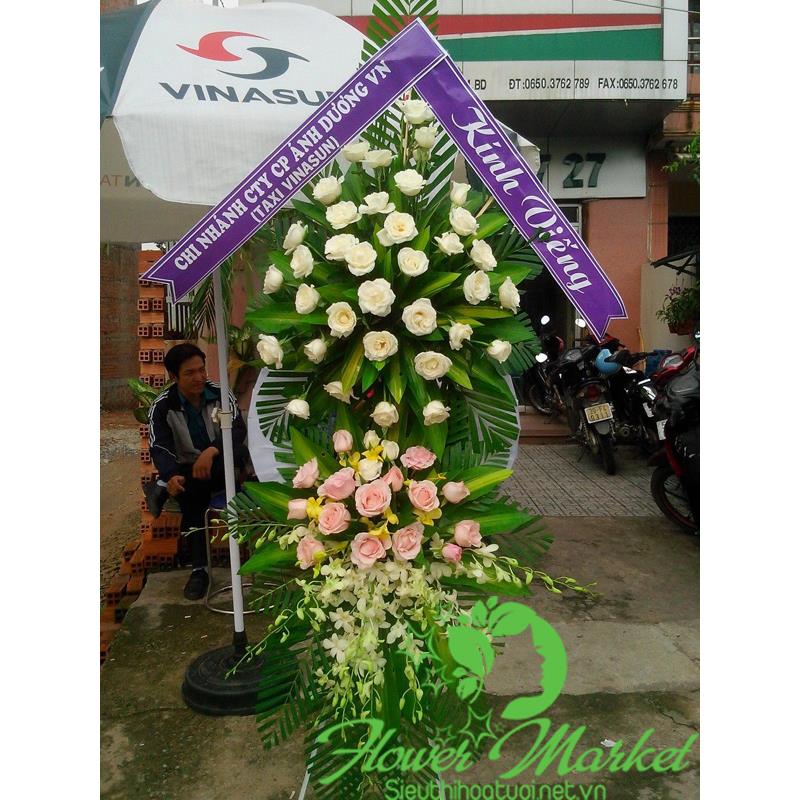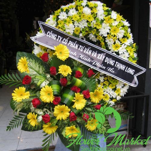 Hoa viếng đám tang cao từ 1,5m - 1,8m với hoa chủ đạo là hoa hồng và hoa cúc kết hợp với hoa lá phụ cùng phụ kiện cao cấp mang thông điệp chia buồn sâu sắc gửi đến thay cho lời động viên, an ủi đến gia quyến người mất và người đã khuất mong sớm...