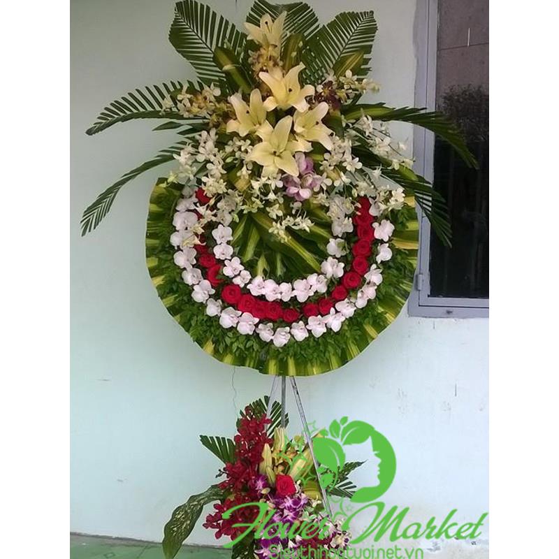 Vòng hoa chia buồn cao từ 1,5m - 1,8m với hoa chủ đạo là hoa lan, hoa hồng và hoa ly kết hợp với hoa lá phụ cùng phụ kiện cao cấp mang thông điệp chia buồn sâu sắc gửi đến thay cho lời động viên, an ủi đến gia quyến người mất và người đã...