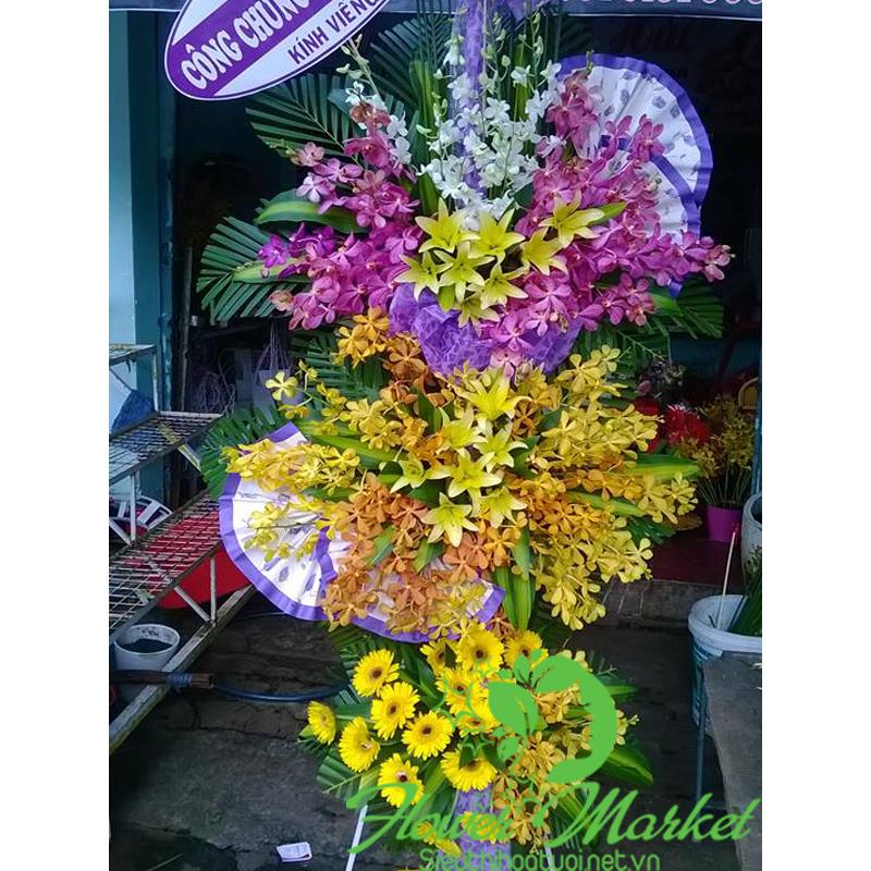 Hoa viếng đám tang cao từ 1,5m - 1,8m với hoa chủ đạo là hoa lan và hoa ly kết hợp với hoa lá phụ cùng phụ kiện cao cấp mang thông điệp chia buồn sâu sắc gửi đến thay cho lời động viên, an ủi đến gia quyến người mất và người đã khuất...