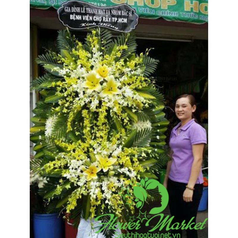 Hoa chia buồn giá rẻ cao từ 1,5m - 1,8m với hoa chủ đạo là hoa lan và hoa hồng kết hợp với hoa lá phụ cùng phụ kiện cao cấp mang thông điệp chia buồn sâu sắc gửi đến thay cho lời động viên, an ủi đến gia quyến người mất và người đã khuất...