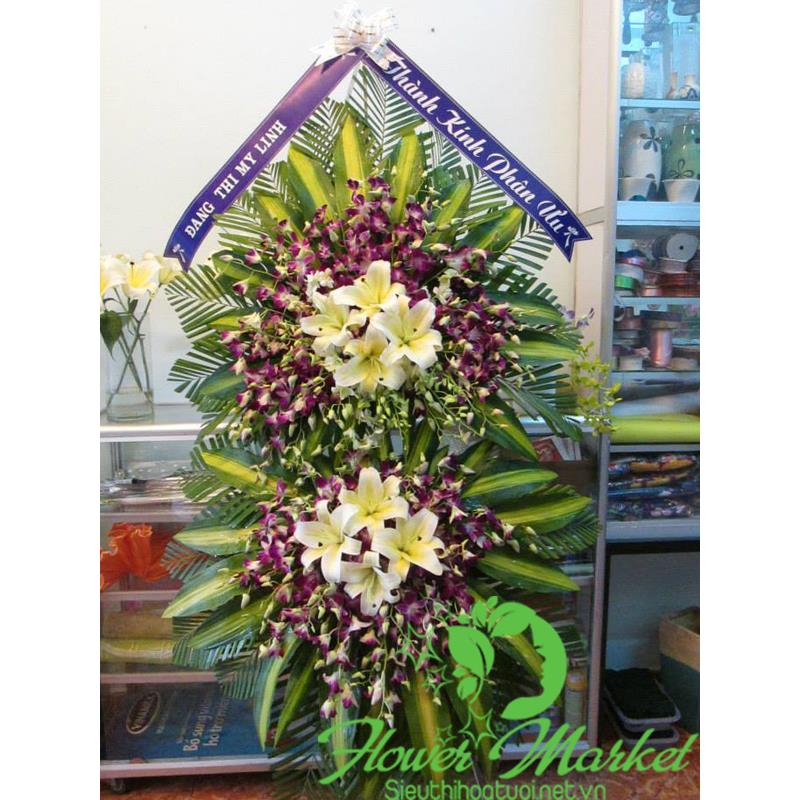 Hoa phúng điếu cao từ 1,5m - 1,8m với hoa chủ đạo là hoa lan, hoa hồng, cẩm tú cầu và hoa ly kết hợp với hoa lá phụ cùng phụ kiện cao cấp mang thông điệp chia buồn sâu sắc gửi đến thay cho lời động viên, an ủi đến gia quyến người mất và người...
