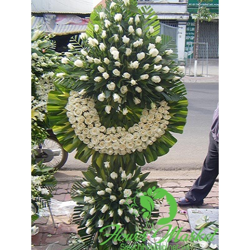 Điện hoa chia buồn cao từ 1,5m - 1,8m với hoa chủ đạo là hoa hồng kết hợp với hoa lá phụ cùng phụ kiện cao cấp mang thông điệp chia buồn sâu sắc gửi đến thay cho lời động viên, an ủi đến gia quyến người mất và người đã khuất mong sớm được siêu thoát.