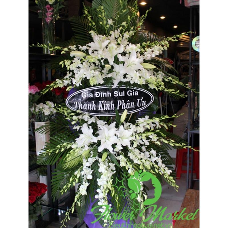 Hoa chia buồn giá rẻ cao từ 1,5m - 1,8m với hoa chủ đạo là hoa lan và hoa ly kết hợp với hoa lá phụ cùng phụ kiện cao cấp mang thông điệp chia buồn sâu sắc gửi đến thay cho lời động viên, an ủi đến gia quyến người mất và người đã khuất mong sớm được siêu thoát.