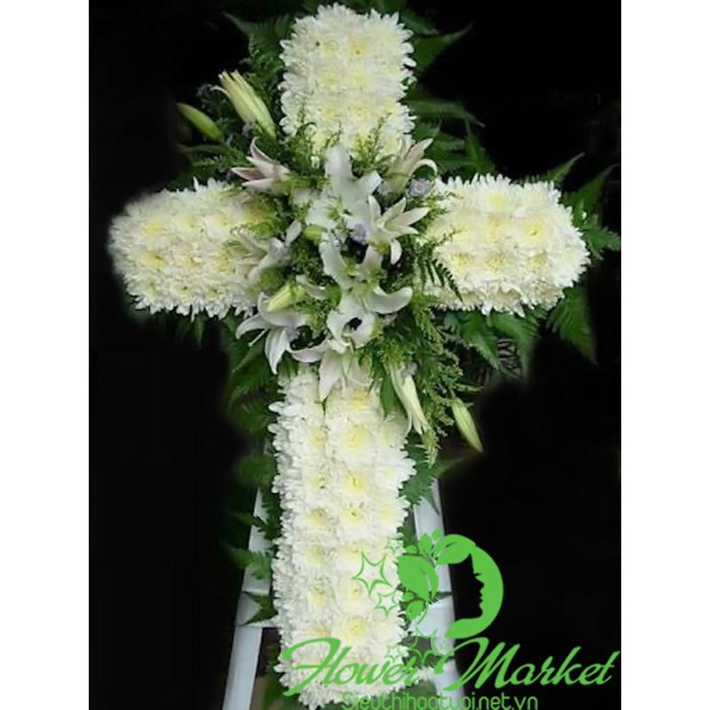 Hoa chia buồn cao từ 1,5m - 1,8m với hoa chủ đạo là cúc trắng và ly trắng, kết hợp với hoa lá phụ cùng phụ kiện cao cấp mang thông điệp chia buồn sâu sắc gửi đến thay cho lời động viên, an ủi đến gia quyến người mất và người đã khuất mong sớm được siêu thoát.