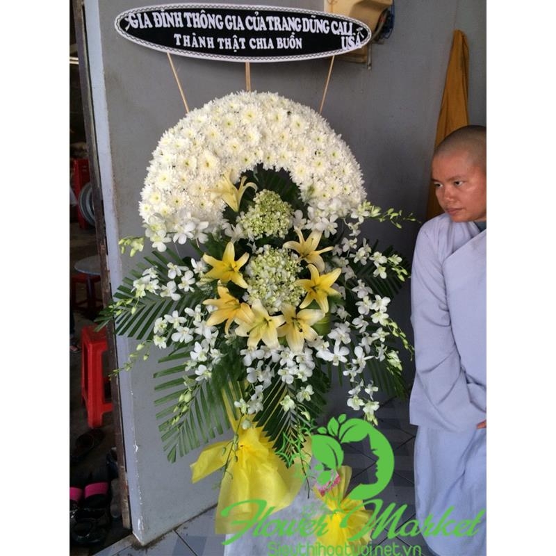 Hoa hỷ sự cao từ 1,5m - 1,8m với hoa chủ đạo là hoa lan, hoa cúc, cẩm tú cầu và hoa ly kết hợp với hoa lá phụ cùng phụ kiện cao cấp mang thông điệp chia buồn sâu sắc gửi đến thay cho lời động viên, an ủi đến gia quyến người mất và người đã khuất mong sớm được siêu thoát.