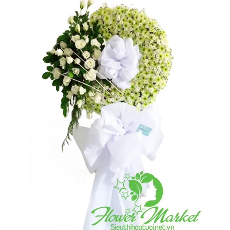 Hoa kính viếng cao từ 1,5m - 1,8m với hoa chủ đạo là hoa cúc và hoa hồng kết hợp với hoa lá phụ cùng phụ kiện cao cấp mang thông điệp chia buồn sâu sắc gửi đến thay cho lời động viên, an ủi đến gia quyến người mất và người đã khuất mong sớm được siêu thoát.