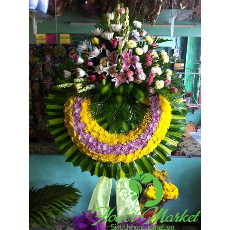 Hoa tang lễ cao từ 1,5m - 1,8m với hoa chủ đạo là hoa cúc, cát tường và hoa ly kết hợp với hoa lá phụ cùng phụ kiện cao cấp mang thông điệp chia buồn sâu sắc gửi đến thay cho lời động viên, an ủi đến gia quyến người mất và người đã khuất mong sớm được siêu thoát.