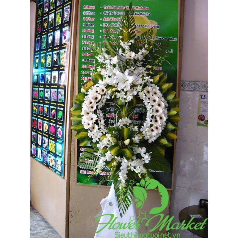 Hoa viếng đám ma cao từ 1,5m - 1,8m với hoa chủ đạo là hoa lan và đồng tiền kết hợp với hoa lá phụ cùng phụ kiện cao cấp mang thông điệp chia buồn sâu sắc gửi đến thay cho lời động viên, an ủi đến gia quyến người mất và người đã khuất mong sớm được siêu thoát.