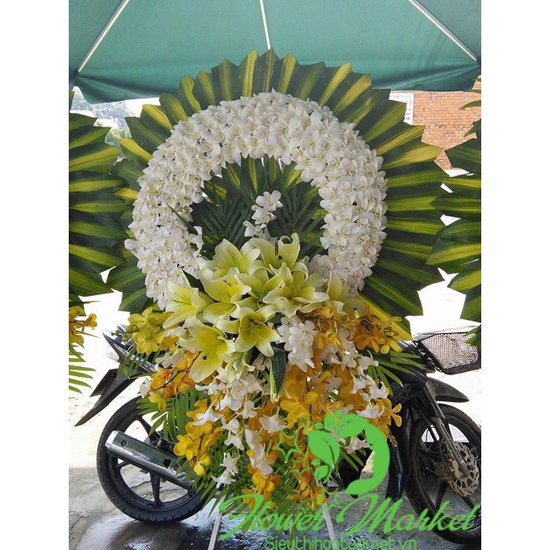 Kệ hoa chia buồn cao từ 1,5m - 1,8m với hoa chủ đạo là hoa lan và hoa ly kết hợp với hoa lá phụ cùng phụ kiện cao cấp mang thông điệp chia buồn sâu sắc gửi đến thay cho lời động viên, an ủi đến gia quyến người mất và người đã khuất mong sớm được siêu thoát.