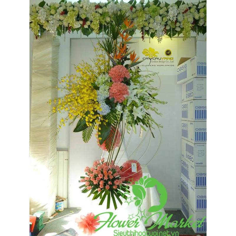Hoa khai trương đẹp cao từ 1,5 - 1,8 mét với hoa chủ đạo là hoa lan, hoa ly, hoa hồng và thiên điểu kết hợp với hoa lá phụ, cùng phụ kiện cao cấp kèm thông điệp lời nhắn mang ý nghĩa chúc mừng thịnh vượng đến cho doanh nghiệp, công...
