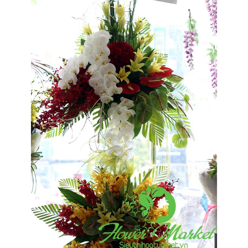Hoa khai trương đẹp cao từ 1,5 - 1,8 mét với hoa chủ đạo là hoa lan, hoa ly, hồng môn và thiên điểu kết hợp với hoa lá phụ, cùng phụ kiện cao cấp kèm thông điệp lời nhắn mang ý nghĩa chúc mừng thịnh vượng đến cho doanh nghiệp, công...
