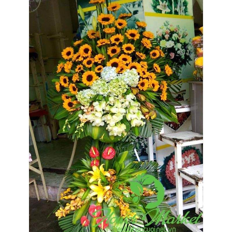 Điện hoa khai trương cao từ 1,5 - 1,8 mét với hoa chủ đạo là hoa hướng dương, hoa lan, cẩm tú cầu và hoa ly kết hợp với hoa lá phụ, cùng phụ kiện cao cấp kèm thông điệp lời nhắn mang ý nghĩa chúc mừng thịnh vượng đến cho doanh nghiệp, công ty...