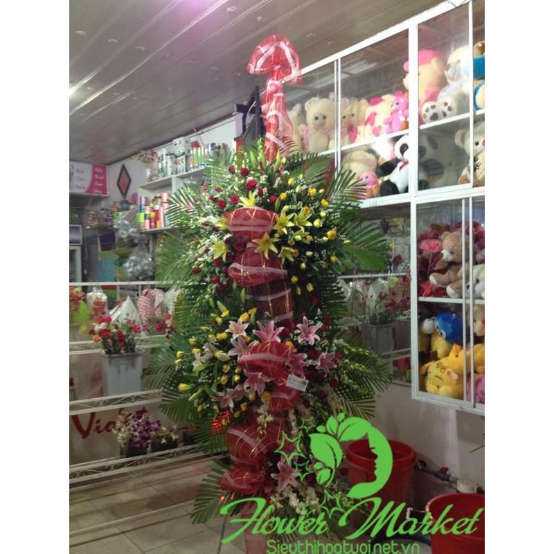Hoa tặng khai trương cao từ 1,5 - 1,8 mét với hoa chủ đạo là hoa hồng và hoa ly kết hợp với hoa lá phụ, cùng phụ kiện cao cấp kèm thông điệp lời nhắn mang ý nghĩa chúc mừng thịnh vượng đến cho doanh nghiệp, công ty...