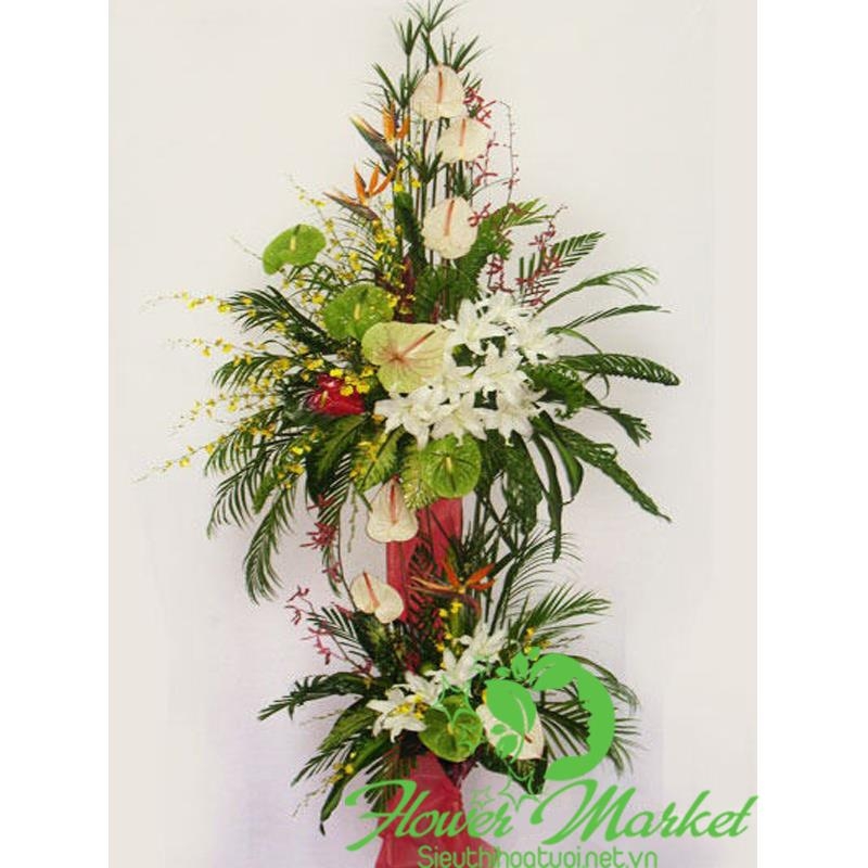 Hoa tươi chúc mừng khai trương cao từ 1,5 - 1,8 mét với hoa chủ đạo là hoa ly, hoa lan và hồng môn kết hợp với hoa lá phụ, cùng phụ kiện cao cấp kèm thông điệp lời nhắn mang ý nghĩa chúc mừng thịnh vượng đến cho doanh nghiệp, công ty...