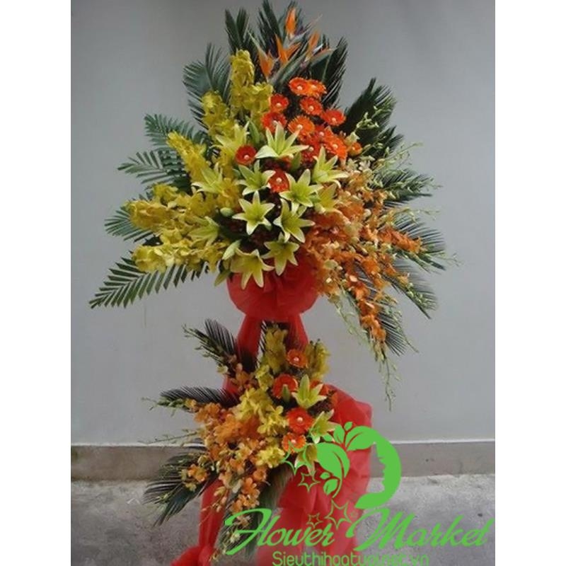 Hoa tươi chúc mừng khai trương cao từ 1,5 - 1,8 mét với hoa chủ đạo là hoa lan, hoa ly, thiên điểu và đồng tiền kết hợp với hoa lá phụ, cùng phụ kiện cao cấp kèm thông điệp lời nhắn mang ý nghĩa chúc mừng thịnh vượng đến cho doanh nghiệp, công ty...