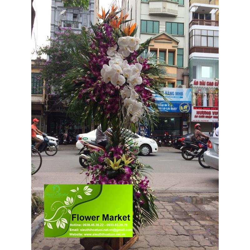 Hoa khai trương sang trọng cao từ 1,5 - 1,8 mét với hoa chủ đạo là hoa ly, thiên điểu và hoa lan kết hợp với hoa lá phụ, cùng phụ kiện cao cấp kèm thông điệp lời nhắn mang ý nghĩa chúc mừng thịnh vượng đến cho doanh nghiệp, công ty...