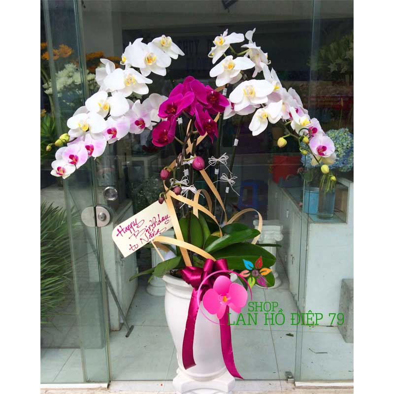 Chậu lan hồ điệp đẹp được phối ghép 5 cành hoa lan trắng tím với thiết kế sang trọng và đẹp mắt sẽ là món quà thật ý nghĩa để tặng cho bạn bè, người thân, khách hàng, đối tác... Sản phẩm rất phù hợp đặt ở bàn làm việc, trước sảnh văn phòng công ty, nhà hàng, khách sạn, cửa hàng. Ngoài ra hoa lan hồ điệp còn được tặng vào những dịp chúc mừng khai trương, sinh nhật, khánh thành, hội nghị, thăng chức, mừng thọ, ngày cưới, kỉ niệm thành lập công ty...