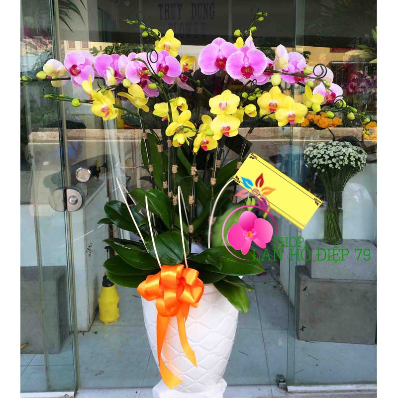 Chậu lan hồ điệp đẹp được phối ghép 6 cành hoa lan vàng tím với thiết kế sang trọng và đẹp mắt sẽ là món quà thật ý nghĩa để tặng cho bạn bè, người thân, khách hàng, đối tác... Sản phẩm rất phù hợp đặt ở bàn làm việc, trước sảnh văn phòng công ty, nhà hàng, khách sạn, cửa hàng. Ngoài ra hoa lan hồ điệp còn được tặng vào những dịp chúc mừng khai trương, sinh nhật, khánh thành, hội nghị, thăng chức, mừng thọ, ngày cưới, kỉ niệm thành lập công ty...