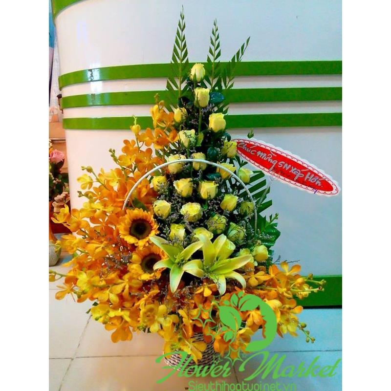Hoa chúc mừng giá rẻ với hoa chủ đạo là hoa ly, hướng dương, hoa hồng và hoa lan kết hợp với hoa lá phụ, cùng phụ kiện cao cấp kèm thông điệp lời nhắn mang ý nghĩa chúc mừng mọi sự tốt đẹp luôn đến với người thân, bạn bè, đồng nghiệp.