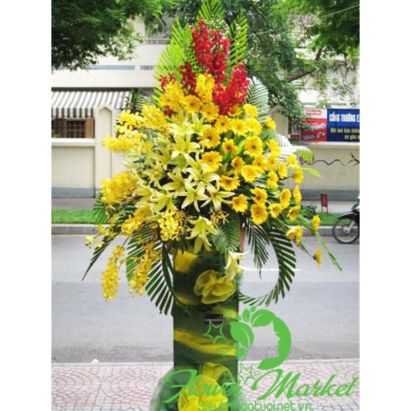 Hoa chúc mừng lễ khai giảng cao từ 1.5 - 1.6m với hoa chủ đạo là hoa ly, đồng tiền và hoa lan kết hợp với hoa lá phụ, cùng phụ kiện cao cấp kèm thông điệp lời nhắn mang ý nghĩa chúc mừng cho sự mở đầu được suông sẻ và tạo hứng khởi cho suốt một năm học.