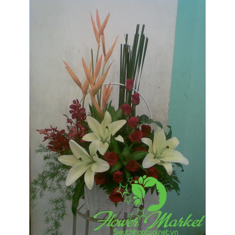 Giỏ hoa tươi với hoa chủ đạo là hoa hồng, thiên điểu và hoa ly kèm phụ kiện trang trí cao cấp kết hợp với hoa lá phụ cùng thông điệp mang lời chúc ý nghĩa gửi đến những người thân yêu nhất.