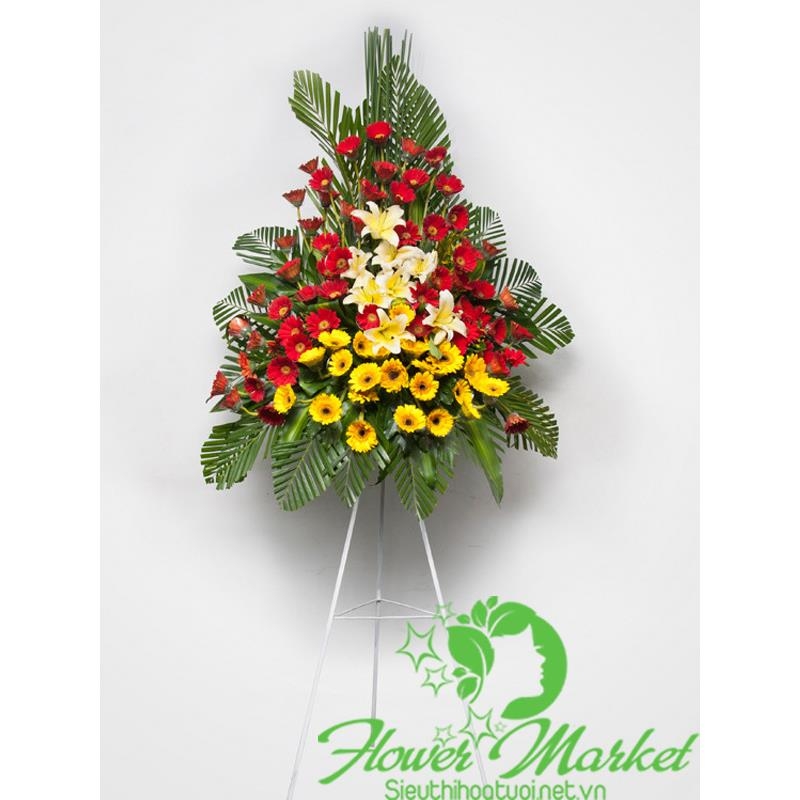 Hoa khai trương cửa hàng cao từ 1,5 - 1,8 mét với hoa chủ đạo là hoa ly và đồng tiền kết hợp với hoa lá phụ, cùng phụ kiện cao cấp kèm thông điệp lời nhắn mang ý nghĩa chúc mừng thịnh vượng đến cho doanh nghiệp, công ty...