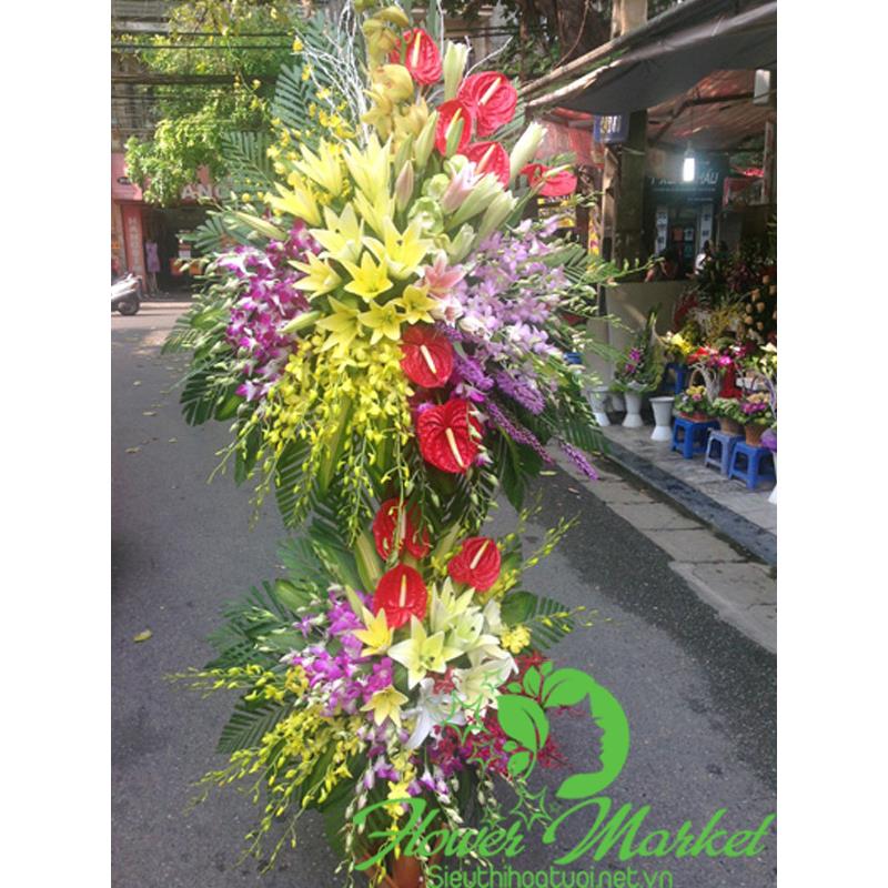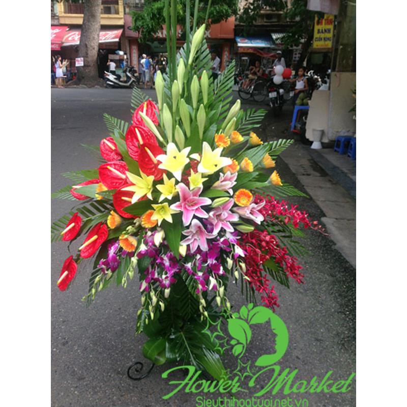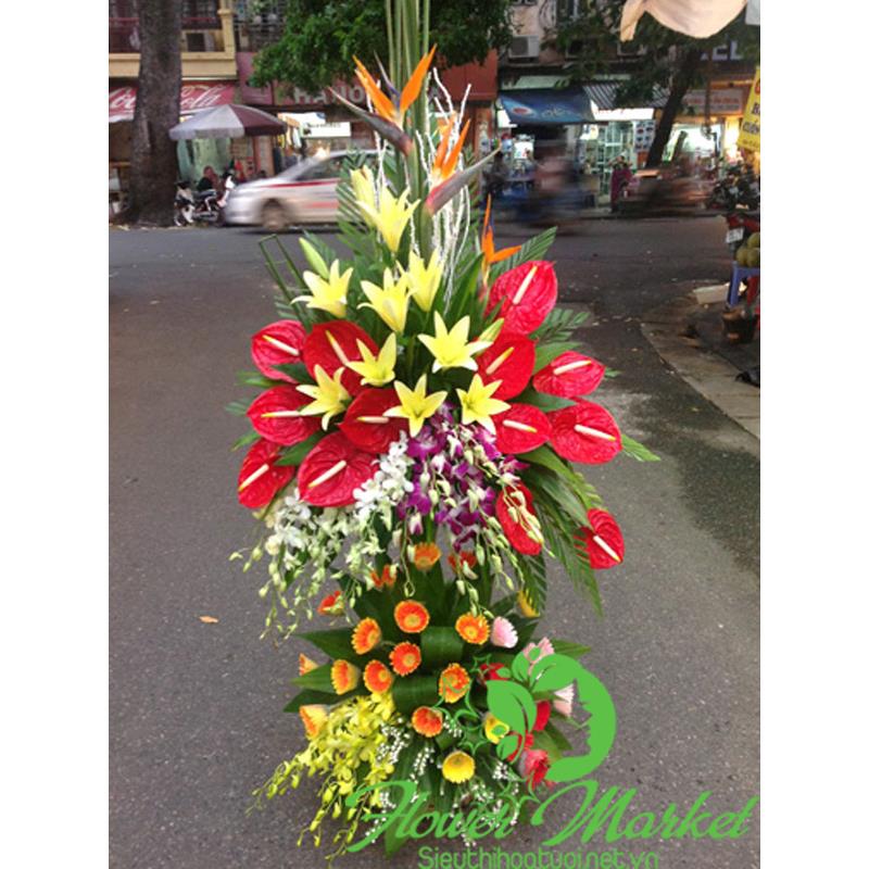 Hoa tươi chúc mừng khai trương cao từ 1,5 - 1,8 mét với hoa chủ đạo là hoa hồng môn, hoa lan và hoa ly kết hợp với hoa lá phụ, cùng phụ kiện cao cấp kèm thông điệp lời nhắn mang ý nghĩa chúc mừng thịnh vượng đến cho doanh nghiệp, công ty... Thượng...