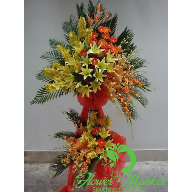 Hoa tươi chúc mừng khai trương cao từ 1,5 - 1,8 mét với hoa chủ đạo là hoa lan, hoa ly và hồng môn đỏ kết hợp với hoa lá phụ, cùng phụ kiện cao cấp kèm thông điệp lời nhắn mang ý nghĩa chúc mừng thịnh vượng đến cho doanh nghiệp, công ty... Thượng...