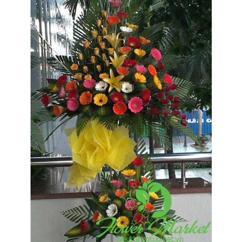 Hoa tươi chúc mừng khai trương cao từ 1,5 - 1,8 mét với hoa chủ đạo là hoa lan, hoa ly, thiên điểu và đồng tiền kết hợp với hoa lá phụ, cùng phụ kiện cao cấp kèm thông điệp lời nhắn mang ý nghĩa chúc mừng thịnh vượng đến cho doanh nghiệp, công ty... Thượng...