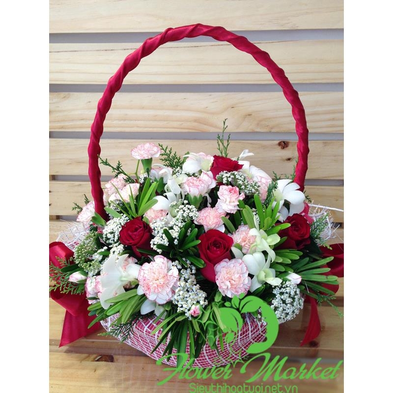 Hoa tặng ngày 20-10 với hoa chủ đạo là hoa hồng và cẩm chướng kết hợp với hoa lá phụ cùng phụ kiện trang trí cao cấp, kèm lời nhắn thông điệp yêu thương gởi đến những người thân yêu nhất !