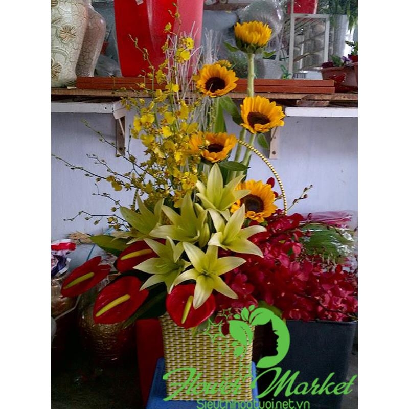 Hoa tặng sinh nhật bạn gái với hoa chủ đạo là hoa lan, hoa ly, hướng dương và hồng môn kết hợp với hoa lá phụ cùng phụ kiện cao cấp kèm thông điệp yêu thương gởi đến những người thân yêu nhất.