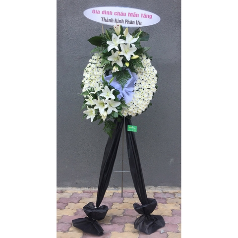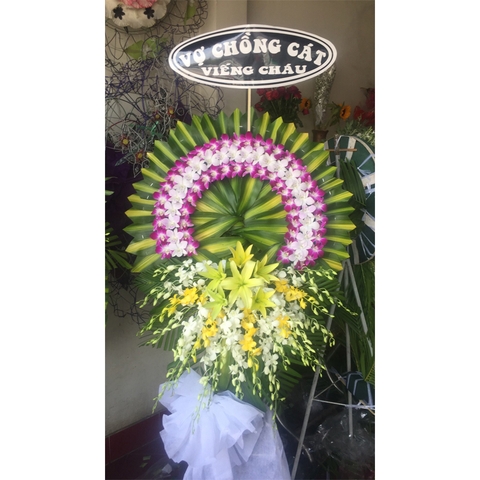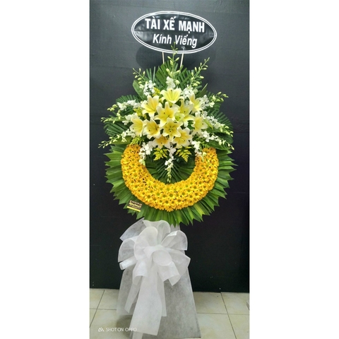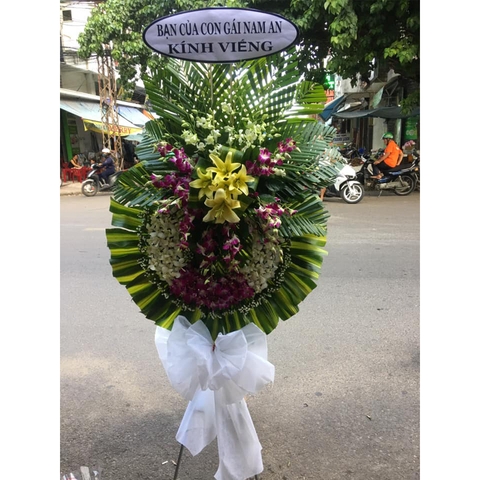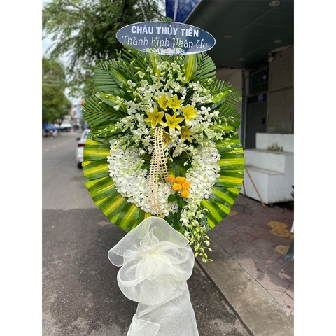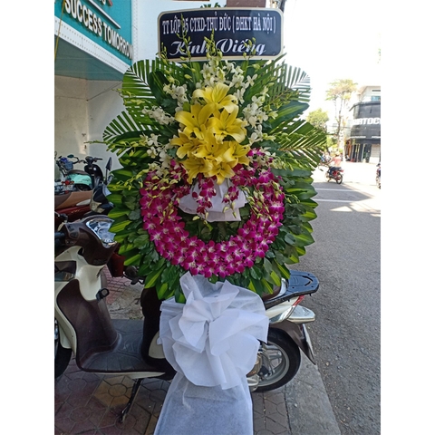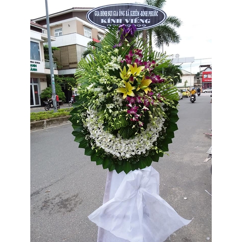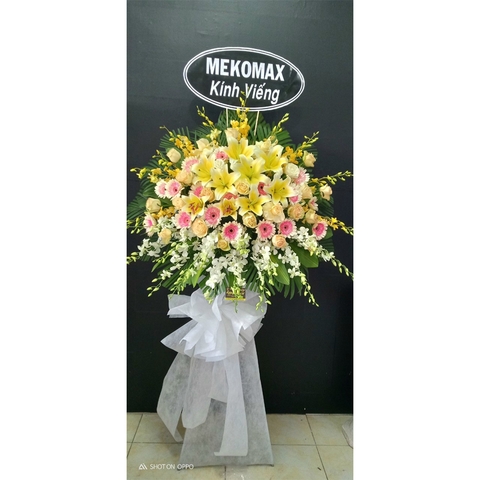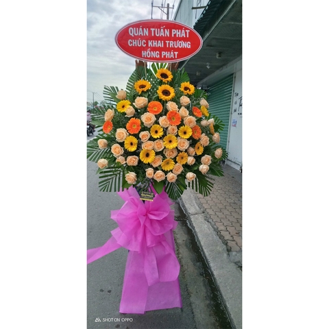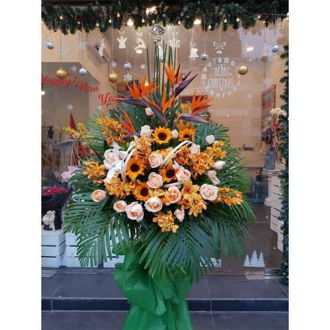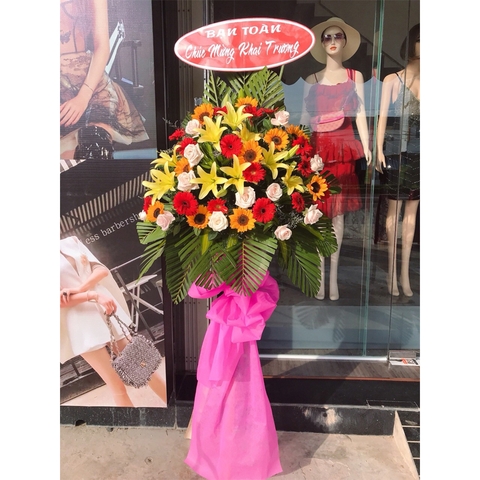 Lẵng hoa chúc mừng khai trương cao từ 1,5 - 1,8 mét với hoa chủ đạo là hoa cẩm ly, hoa lan và hoa hồng kết hợp với hoa lá phụ, cùng phụ kiện cao cấp kèm thông điệp lời nhắn mang ý nghĩa chúc mừng thịnh vượng đến cho doanh nghiệp, công ty...