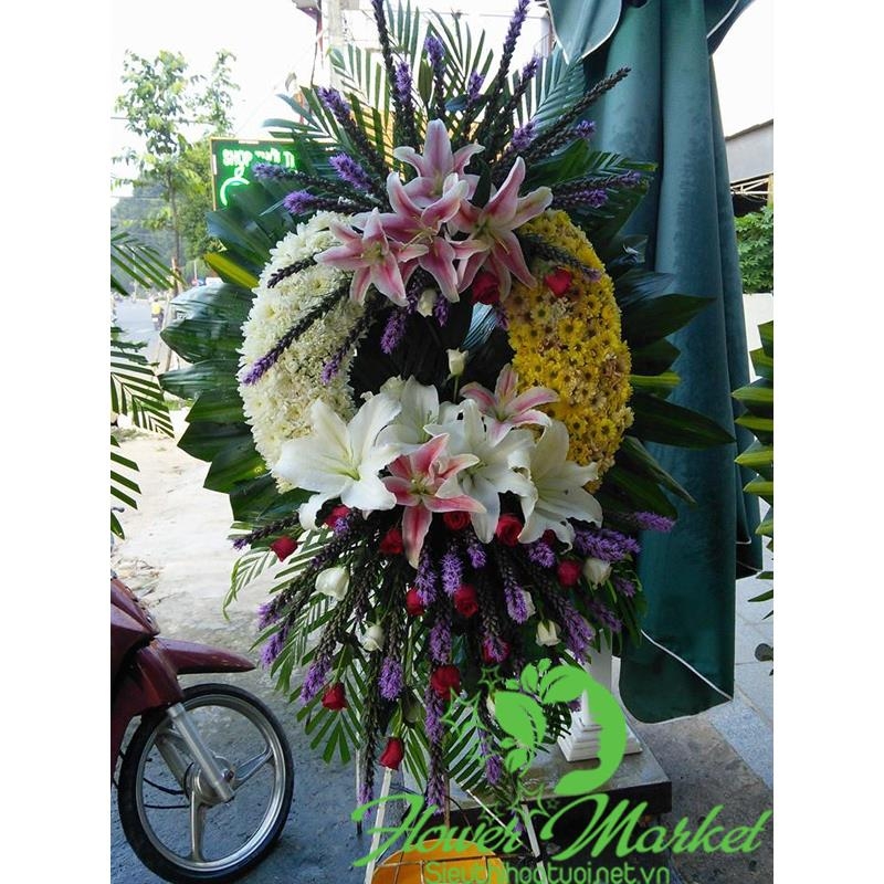 Vòng hoa tang lễ cao từ 1,5m - 1,8m với hoa chủ đạo là hoa lan, hoa cúc và hoa hồng kết hợp với hoa lá phụ cùng phụ kiện cao cấp mang thông điệp chia buồn sâu sắc gửi đến thay cho lời động viên, an ủi đến gia quyến người mất và người đã khuất mong sớm được siêu thoát.